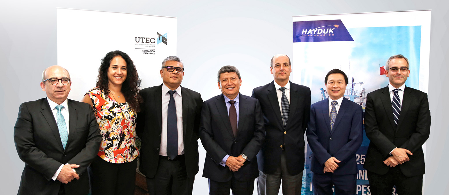 Pablo Nieto, gerente legal de Hayduk Corporación; Claudia Muñoz-Najar, directora de Educación Ejecutiva de UTEC; José Arriola, gerente general de Hayduk Corporación; Walter Martínez, presidente del Directorio de Hayduk Corporación; Carlos Heeren, director ejecutivo de UTEC; Daniel Kanamori, gerente de Administración y RR.HH. de Hayduk Corporación; Ignacio Montero, director de Innovación Empresarial de UTEC.