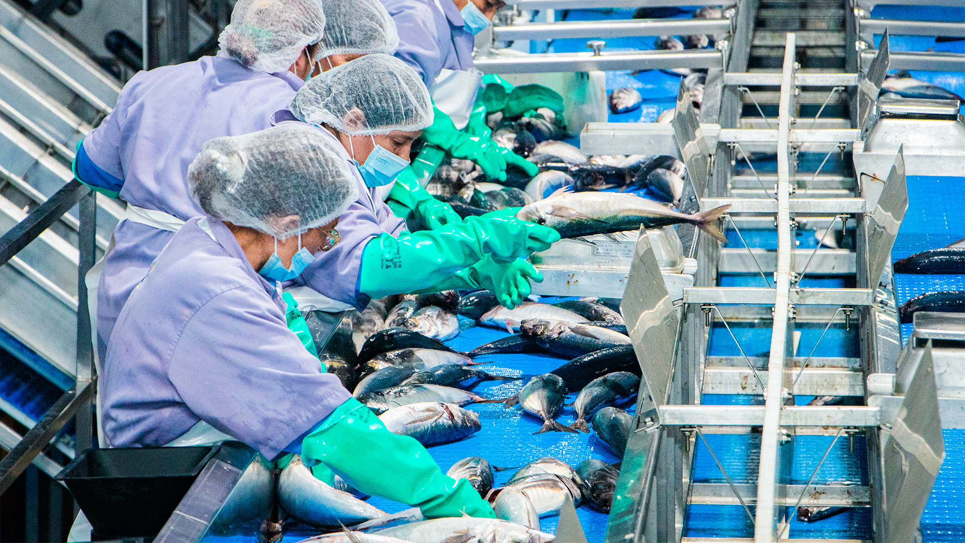 La pesca se separa por rangos de peso mediante un equipo de clasificación industrial. Esto es validado manualmente para eliminar descartes y separar por especies (jurel y caballa).